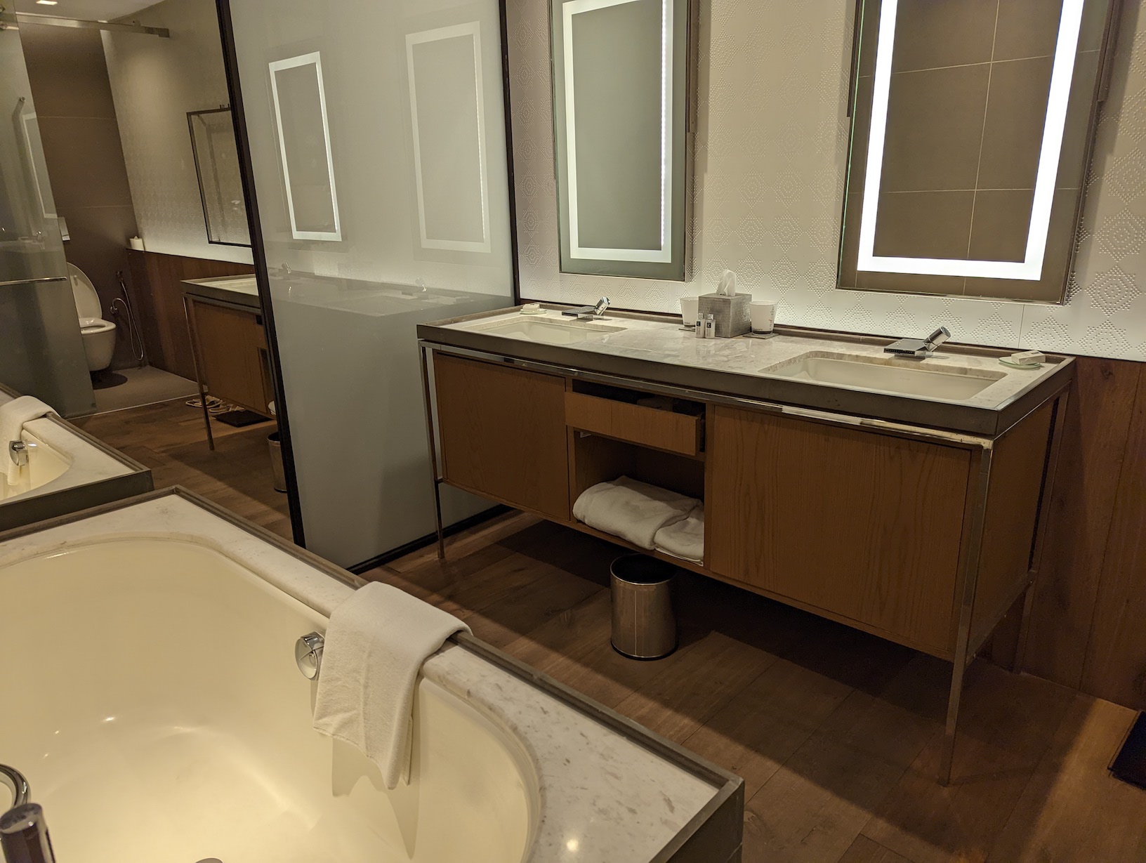 To the right of the entryway was a large restroom featuring a walk in shower, double vanity, and tub. The toiletries were from a brand I had never heard of and the closet had some used slippers and a weighing machine. Again the cleanliness here was not up to snuff and the water pressure and temperature weren’t great.